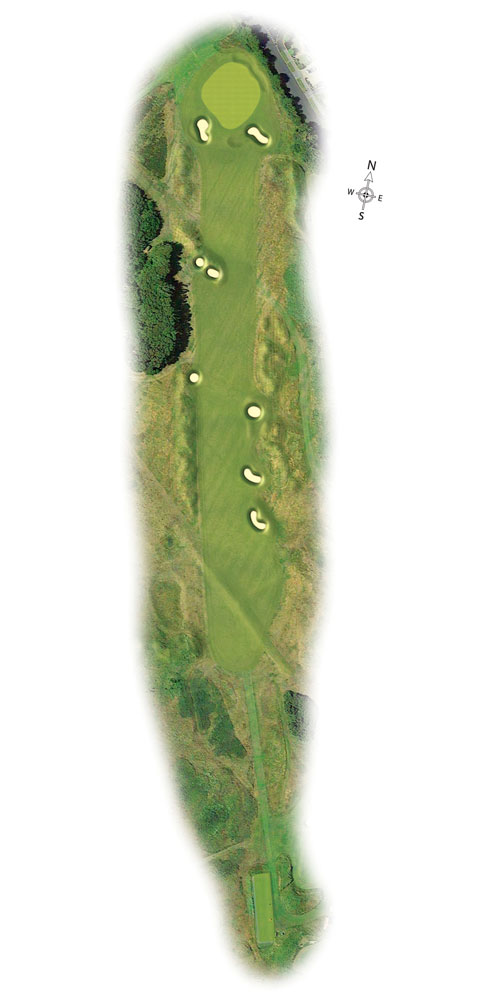 The tee shot has to avoid the bunkers and sandhills on the right and the thick rough-covered mounds on the left if it is to provide a reasonable approach to the green, so the margin for error is minimal, particularly with rough and out-of-bounds so close to the right side of the putting surface.
